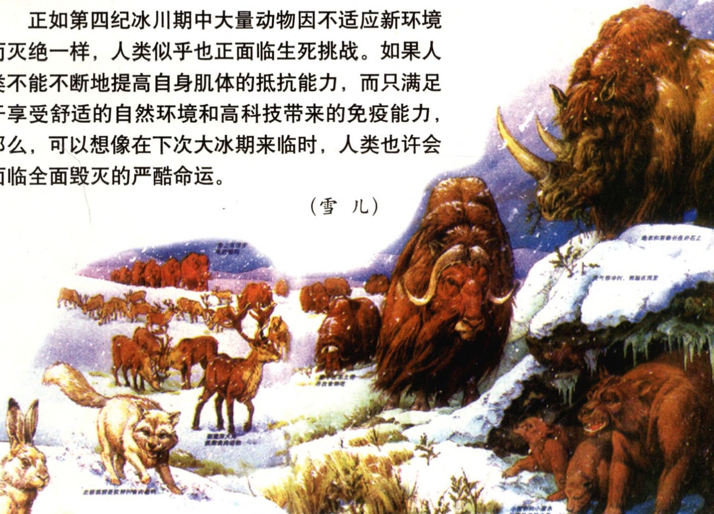 正如第四纪冰川期中大量动物因不适应新环境而灭绝一样,人类似乎也正面临生死挑战。如果人类不能不断地提高自身肌体的抵抗能力,而只满足于享受舒适的自然环境和高科技带来的免疫能力,那么,可以想像在下次大冰期来临时,人类也许会面临全面毁灭的严酷命运。