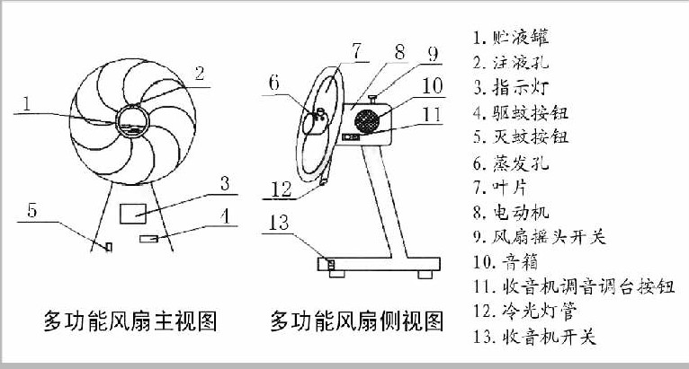 周裕荣同学发明的这种风扇,集送风、收音、遥控、驱蚊、灭蚊等多种功能于一体。其中,送风、收音、遥控功能容易理解,但驱蚊、灭蚊是怎样在风扇的基本功能上实现的呢?原来是利用电扇的气流,将贮液罐(安装在风扇前罩中心位置)中的驱蚊药液挥发出来的气体随风送出,在较大范围内达到纳凉和驱蚊的双重目的;而灭蚊功能则是通过利用冷光灯管发出的光,诱引蚊虫飞扑,让高速旋转的叶片将其击落而实现的。试想一下:在闷热天气里一边吹着风扇一边收听着电台广播,而又不要受蚊虫叮咬之苦,是多么惬意!再加上遥控设备就更为方便了。