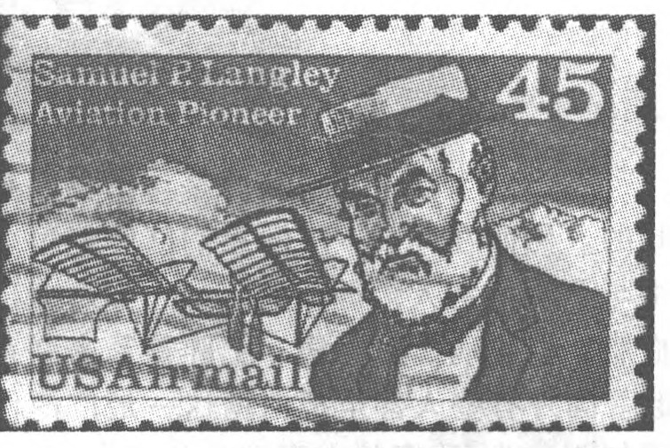 人们都知道莱特兄弟发明了第一架飞机,但对另一位航空事业的先驱——兰利却知之甚少。兰利是美国物理学家、天文学家。他成功制造了第一架重于空气的飞机。并对飞行理论进行了深入研究。为了纪念这位航空先驱,美国发行了一枚面值45美分的邮票,邮票的画面就是兰利和他的飞机(如右图)。