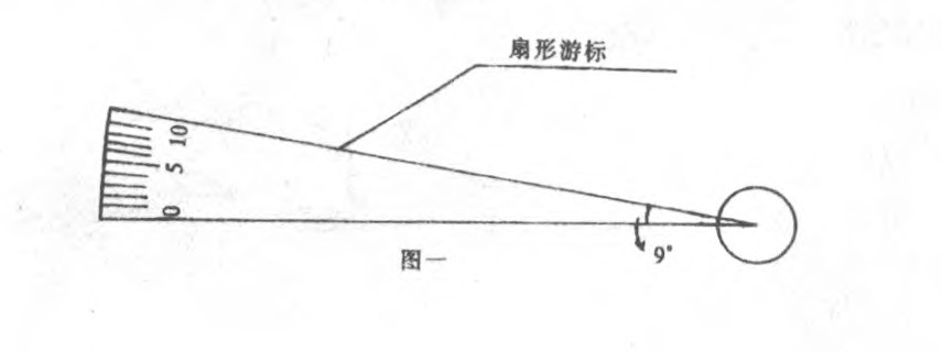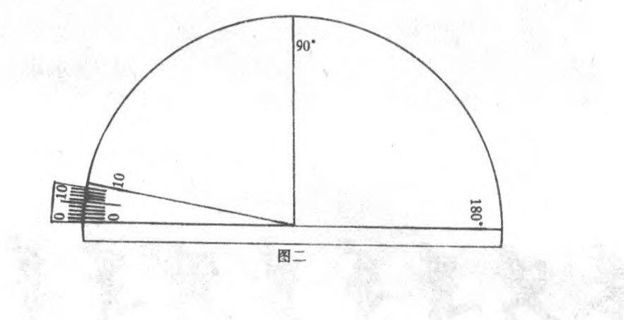 找一较大的量角器和一块透明薄板,将薄板制作成一个夹角为0.9度的扇形游标,如图一所示,在圆弧上划上10条等分刻度线,再将扇形游标和量角器的两圆心铆合,如图二所示,可灵活转动,这样就可以用来测量1度以内的角度了。