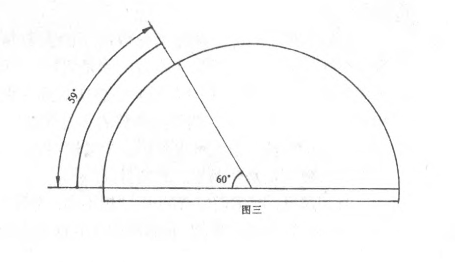当我们要制作精确到分的量角器时,只要取扇形游标的角度为59度,如图三所示划分为60等分,每等分为59 / 60度,因为1-59/60=1/60度,即为1分。