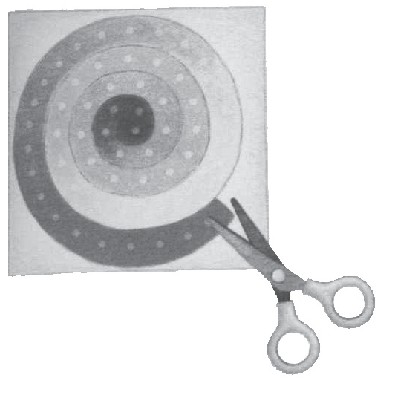 2 用剪刀沿曲线剪开,把纸片剪成螺旋状的纸条,并用剪刀尖在纸条的正中央扎一个孔。