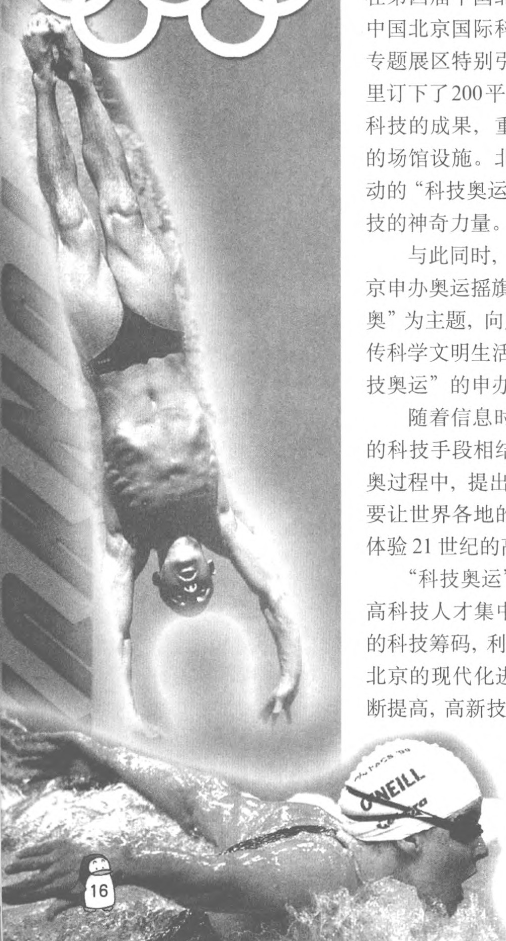 回眸5月, 京被称为“科技奥运月”。在第四届中国北京高新技术产业国际周暨中国北京国际科技博览会上,“科技奥运”专题展区特别引人注目,北京奥申委在这里订下了200平方米的展位,集中展示体育科技的成果,重点包括体育器械和高科技的场馆设施。北京市民不仅接受了一次生动的“科技奥运”洗礼,还充分领略到高科技的神奇力量。