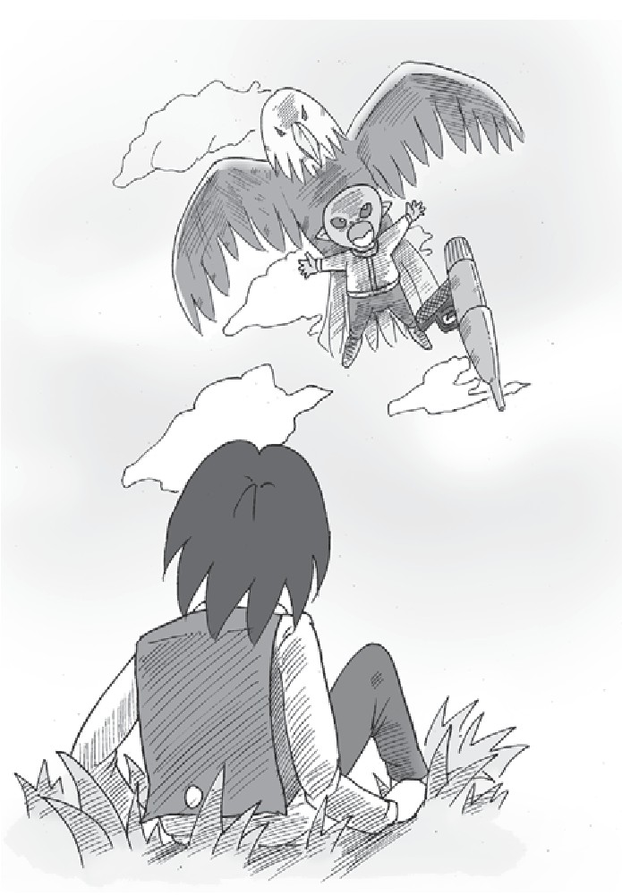 就在这时,空中一只巨大的老鹰箭一般扎了下来。它用利爪勾住外星人的衣服,然后向上飞去。外星人惊慌中把枪也弄丢了。
