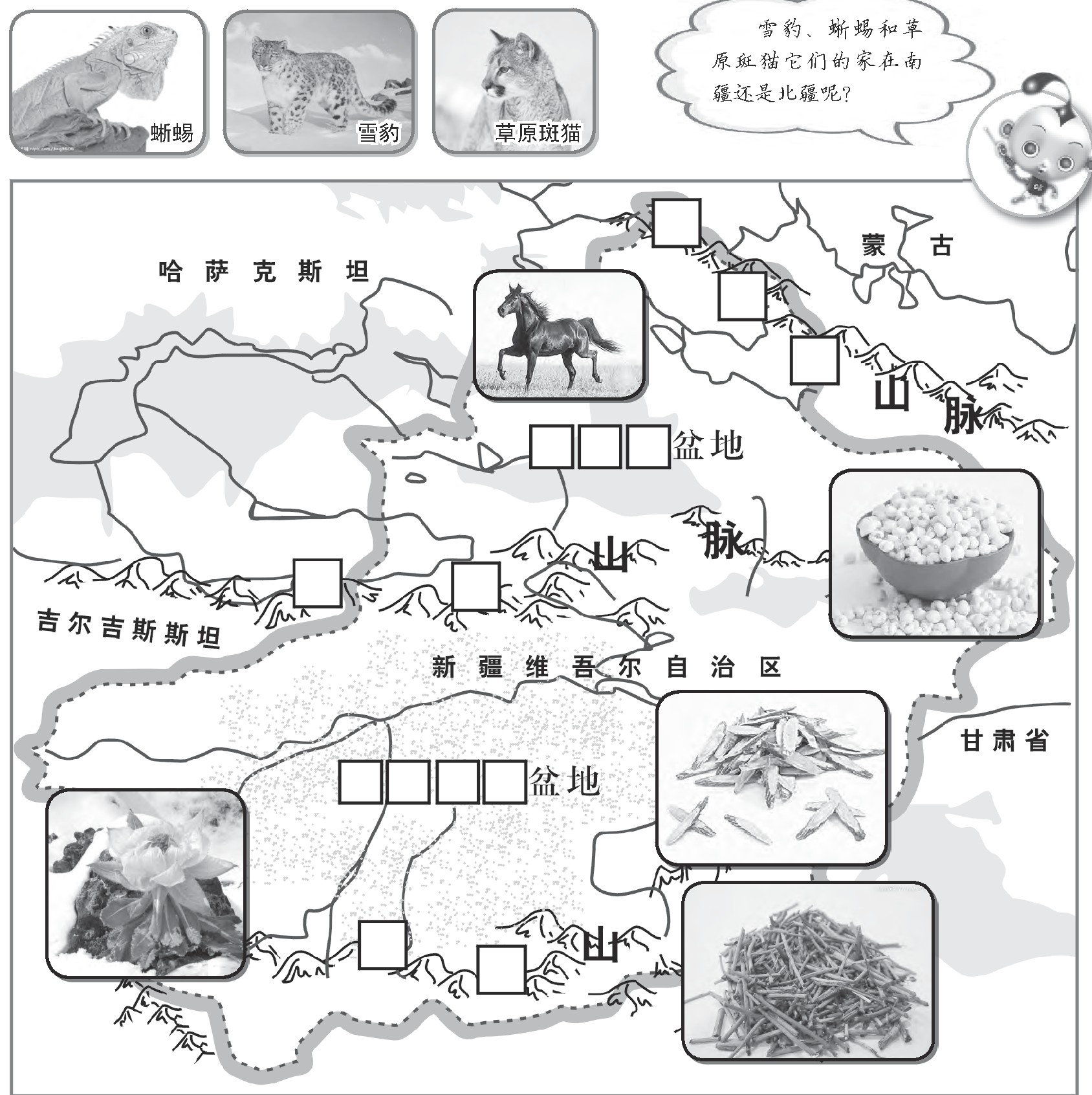 “嗯,新疆不止有好吃的瓜果,这里的矿产资源种类齐全,储量大。目前发现的矿产有138种,其中9种储量居全国首位,32种居西北地区首位。”奥秘精灵继续说,“新疆的野生动物丰富,南、北疆各有不同的野生动物。北疆的兽类有雪豹、紫貂、棕熊等,鸟类有天鹅、雷鸟、雪鸡、啄木鸟等,爬行类有花蛇、草原蝰和游蛇。南疆兽类动物则有骆驼、藏羚羊、野牦牛、野马、塔里木兔、草原斑猫等,爬行类有沙蟒、蜥蜴。如果运气好的话,也许我们还能看到一部分野生动物哦!”