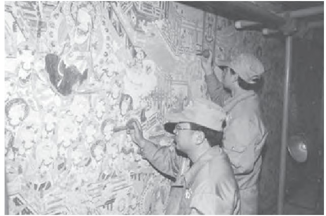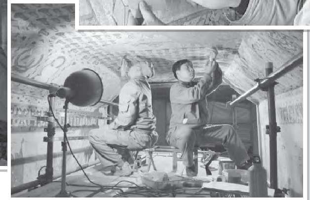 “敦煌文物研究所的工作人员一直在组织抢修行动,加固崖壁和洞窟,抢救大面积脱落的壁画,对部分被烟熏的壁画进行清洗工作,在一定程度上使得莫高窟的危险状况得以改善。现在越来越多的历史学、考古学以及美术工作者都在为修复这些精美的壁画以及彩塑贡献着力量。”