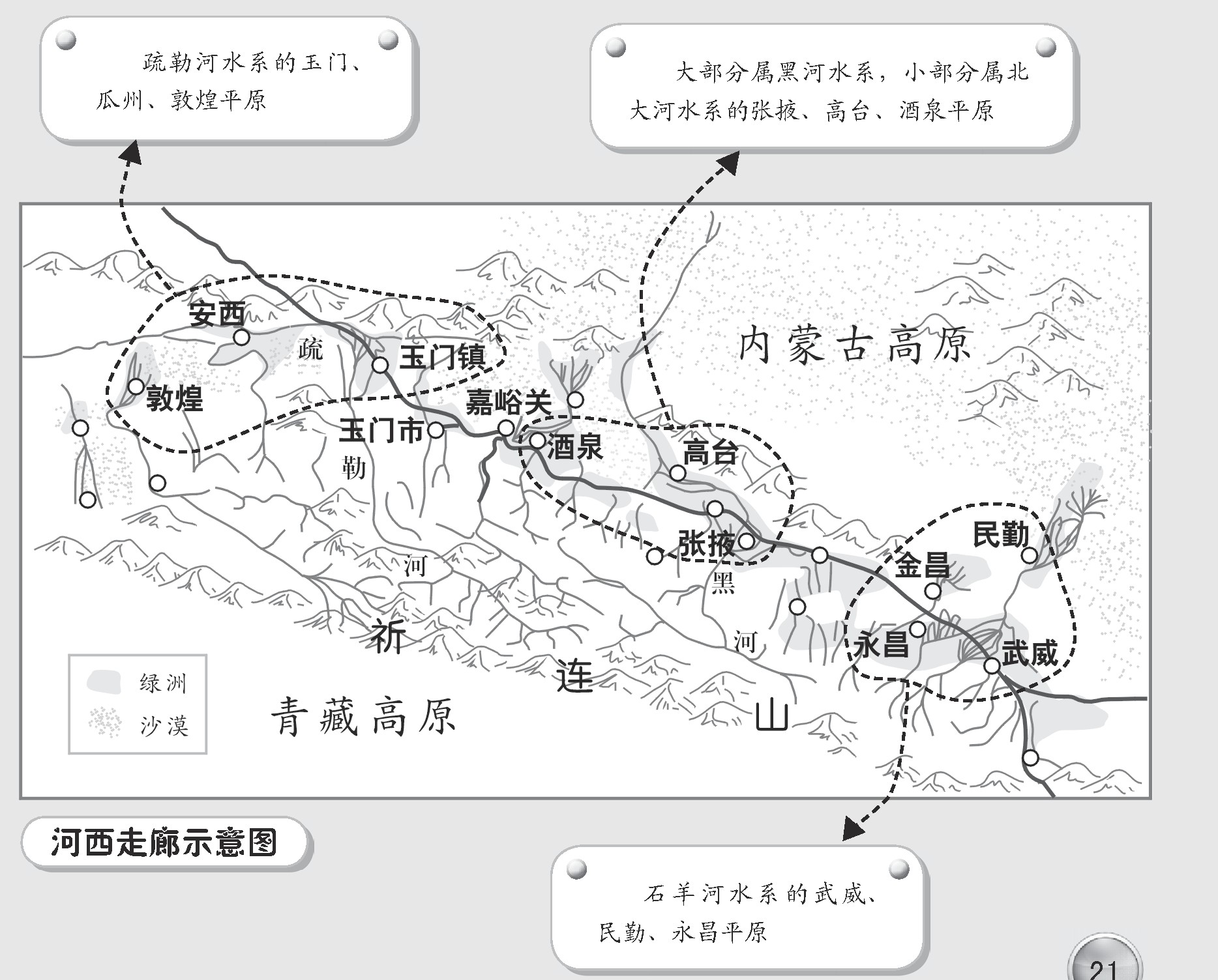 河西走廊分为三个独立的内流盆地:一个是石羊河水系的武威、民勤、永昌平原;一个是大部分属黑水水系,小部分属北大河水系的张掖、高台、酒泉平原;还有一个是属于疏勒河水系的玉门、瓜州、敦煌平原。