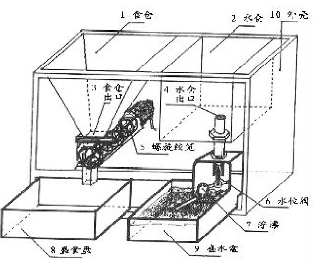 微电脑自动控制宠物喂食机的结构如右图所示。在实用美观的外壳内部上端固定一个方锥型可下漏的食仓和一个占最大空间的方型水仓,各仓下面设有出口。令食仓出口上可装有受控电磁铁带动闸门或用电机带动螺旋绞笼的输出装置,水仓的输出口可用电磁阀控制或水位浮漂阀控制。在两输出口相对应的下面(靠地面)设有两个盛物盘,分别为盛食盘和盛水盘,固定在外壳的前侧。微电脑时间控制器的输出端与食仓、水仓的输出控制装置相连,再配接上合适的电源。这个喂食机的工作原理是首先将专用的食物和水分别放入两仓中,开启电源后再设定好供食、水的日期与时间,以此来确定供食的次数。完成设定后确认,微电脑会自动按设定的日期及时间通过控制装置将食、水从两仓出口输出并落入盛物盘中。根据设定的输出时间的长短控制供食量的多少,从而确保合理喂养。