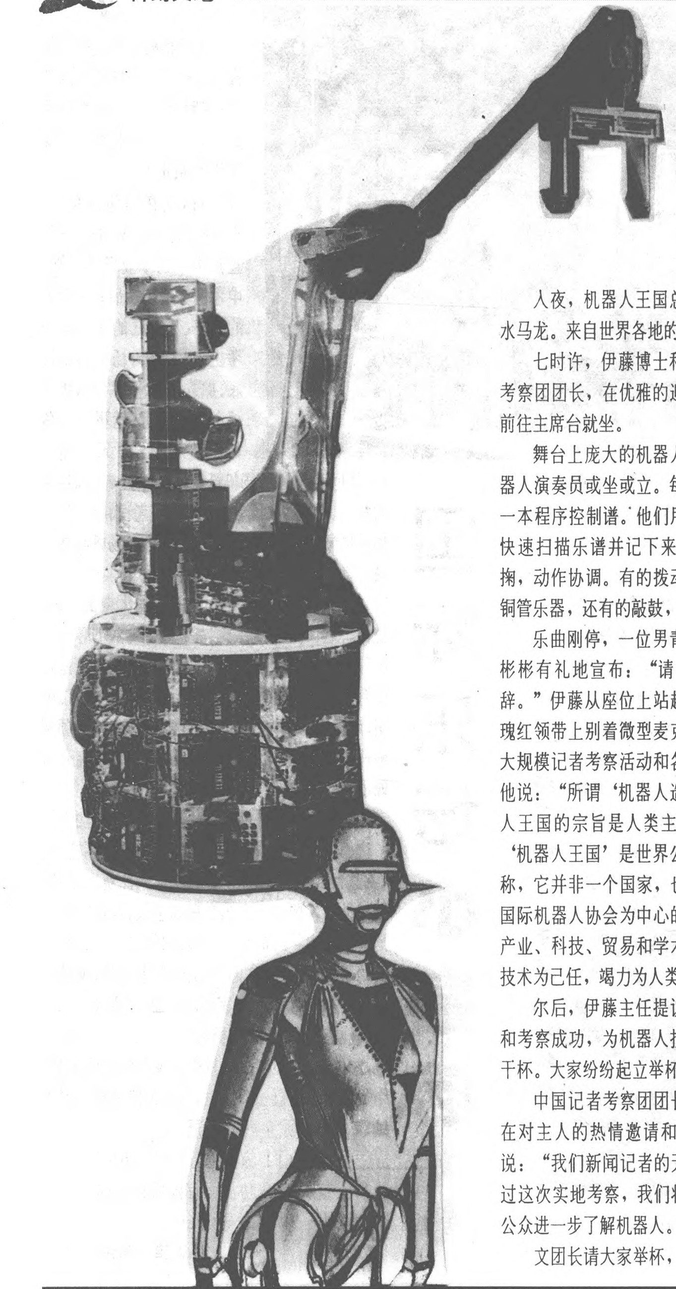 乐曲刚停,一位男青年打扮的机器人走到主席台前,彬彬有礼地宣布:“请机器人王国总部主任伊藤博士致辞。”伊藤从座位上站起,他中等身材,蓄着八字胡,玫瑰红领带上别着微型麦克风。首先他对这次历史上少有的大规模记者考察活动和各国记者团表示诚挚的欢迎。接着他说:“所谓'机器人造反'是某些人制造的骗局,机器人王国的宗旨是人类主宰机器人,机器人服务于人类。'机器人王国'是世界公众给这个国际性机器人组织的美称,它并非一个国家,也不是一个社会政治实体,而是以国际机器人协会为中心的全世界机器人的大联合,一个集产业、科技、贸易和学术于一体的组织。它以发展机器入技术为己任,竭力为人类服务”。