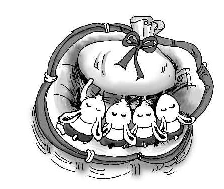 因此我想发明一个“仔兔哺乳袋”。这个袋子模仿母兔的肚子,在下面做一些和母兔乳头大小差不多的仿真乳头。在袋子里可以装热牛奶,然后,放在仔兔们的头顶,仔兔就可以自由地吸食了。除了可以防止仔兔没有奶喝而饿死外,还可以在有些兔妈妈的奶水不够的时候,给小兔人工补充奶水呢。