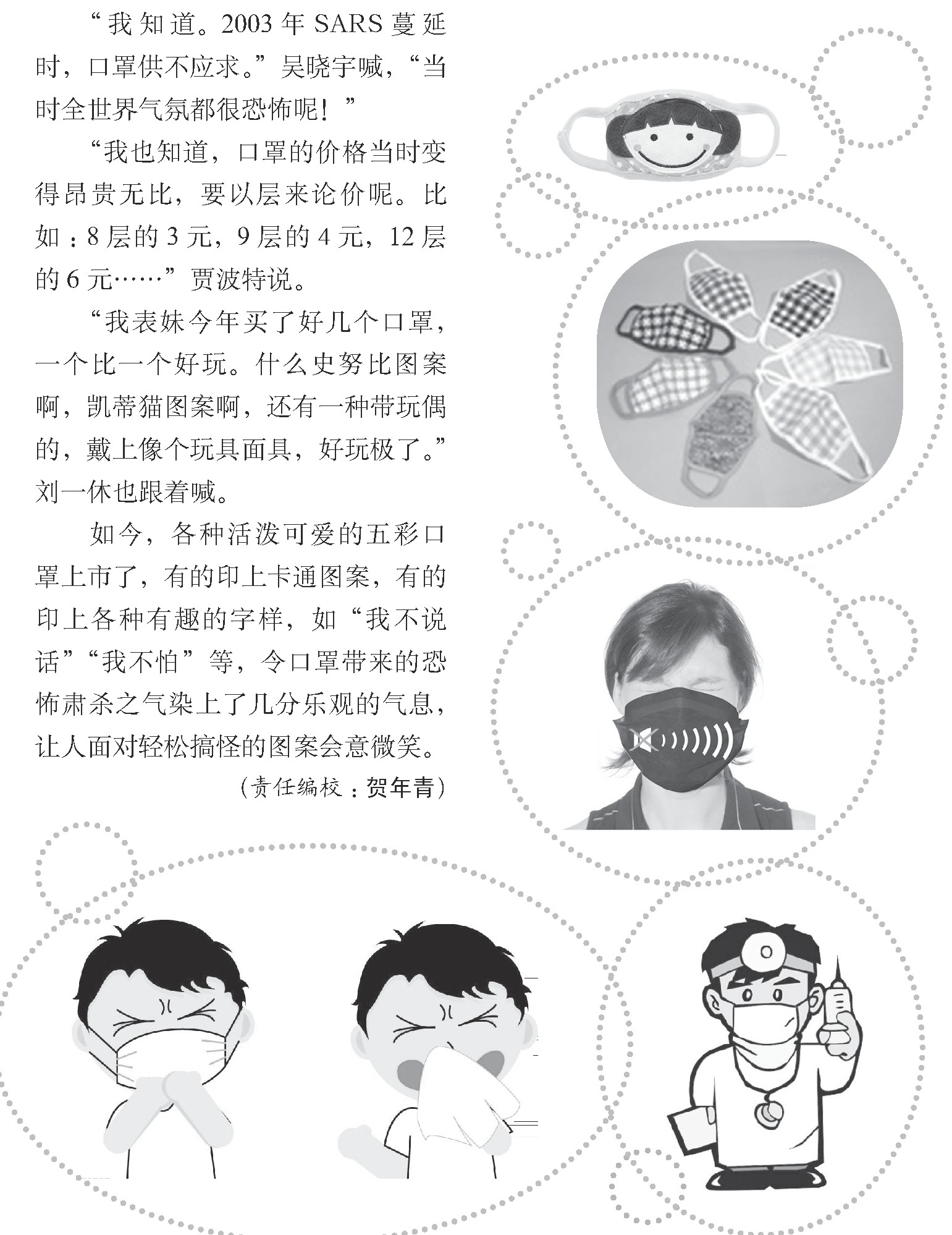 如今,各种活泼可爱的五彩口罩上市了,有的印上卡通图案,有的印上各种有趣的字样,如“我不说话”“我不怕”等,令口罩带来的恐怖肃杀之气染上了几分乐观的气息,让人面对轻松搞怪的图案会意微笑。