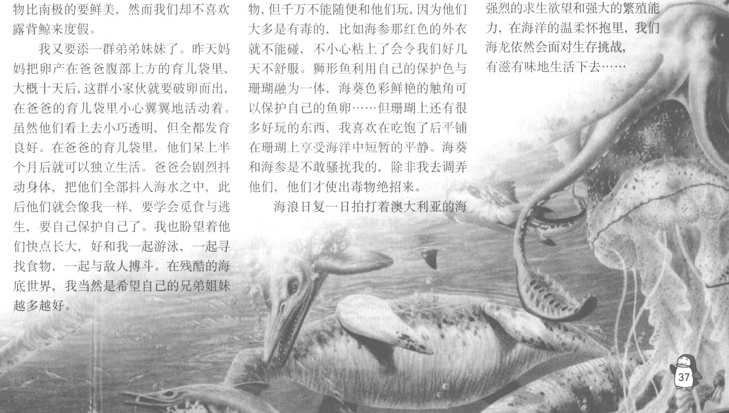 我又要添一群弟弟妹妹了。昨天妈妈把卵产在爸爸腹部上方的育儿袋里,大概十天后,这群小家伙就要破卵而出,在爸爸的育儿袋里小心翼翼地活动着。虽然他们看上去小巧透明,但全都发育良好。在爸爸的育儿袋里,他们呆上半个月后就可以独立生活。爸爸会剧烈抖动身体,把他们全部抖入海水之中,此后他们就会像我一样,要学会觅食与逃生,要自己保护自己了。我也盼望着他们快点长大,好和我一起游泳,一起寻找食物,一起与敌人搏斗。在残酷的海底世界,我当然是希望自己的兄弟姐妹越多越好。