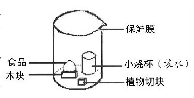 第1次实验:在烧杯内放入约1立方厘米的天然植物切块,并放入一饮料瓶盖或塑料小烧杯。瓶盖或小烧杯中装有l毫升左右的水,其目的是防止植物切块和食品干燥。在烧杯内放上一块木块。将食品馒头、苹果切块与鹌鹑蛋一起放入烧杯中,最后用保鲜膜覆盖烧杯口,进行密封。同时做一组对照实验,只是不在烧杯内放入天然植物切块,其他条件相同,接着进行观察并记录实验结果。