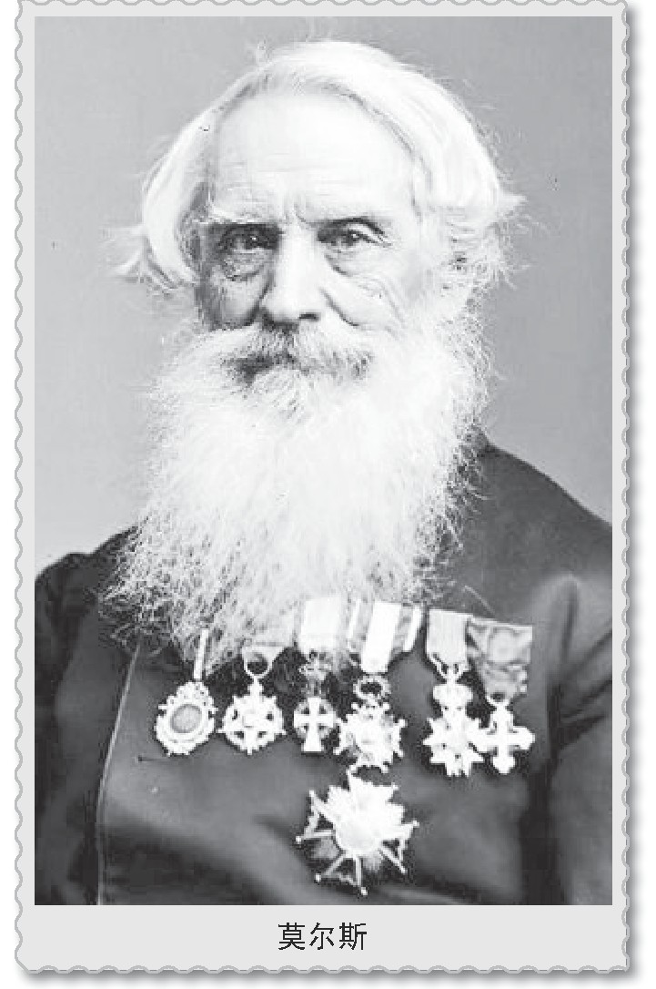 萨缪尔·芬利·布里斯·莫尔斯(1791—1872),美国画家,有线电报的发明人。为了制造电报机,他花完了所有的积蓄,于1837年研制出世界上第一台传递电码的电报机。他发明了一连串的点、划来代表各个字母和数字,也就是今天的莫尔斯电码。他还设计出一套发送电报的线路,并于1844年5月24日完成了世界上第一次电报通讯。