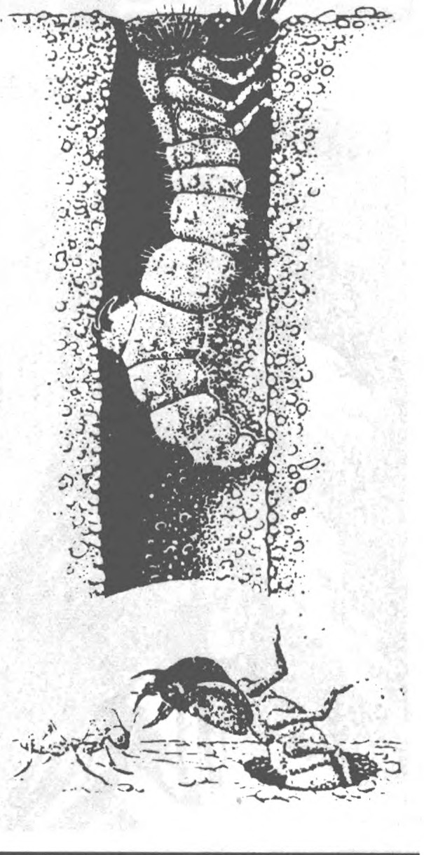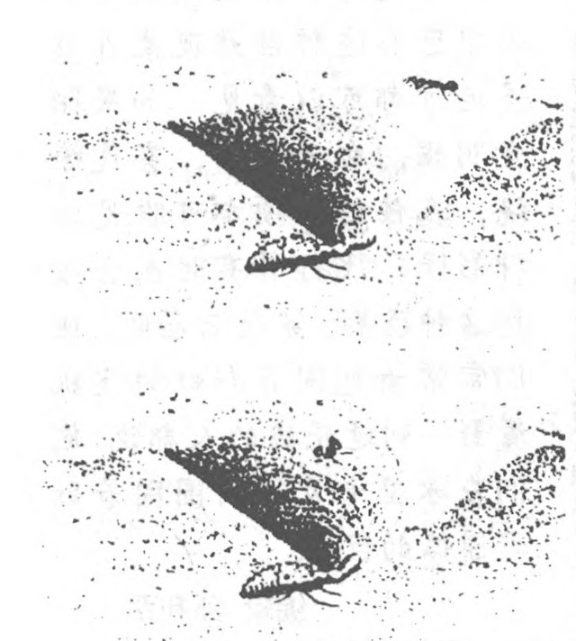 伏击战术打好埋伏,等待敌人的出现,打它个措手不及,恐怕是最有效的战斗方法。当然昆虫的伏击战术有点像守株待兔。你看虎?虫。它先找一个昆虫经常路过的地方,然后挖一个约有半米深的垂直穴道,穴道的直径只比它本身宽一点点,大概是铅笔大小的样子。肚子饿了,虎?虫便聚精会神地听附近的脚步声,等候疏忽大意的猎物经过。虎?虫长着一个庞大的头,它在洞口把头弯下来,以便和地面保持同一平面,像洞口的盖子,难以发现(如下图)。月牙形状的上下颚能够以飞快的速度捕捉路过的昆虫。力量大的昆虫不能把它从穴洞里拉出来,因为它腹部长着两把钩子,像轮船的锚,可以把自己的身体钩在墙壁上。