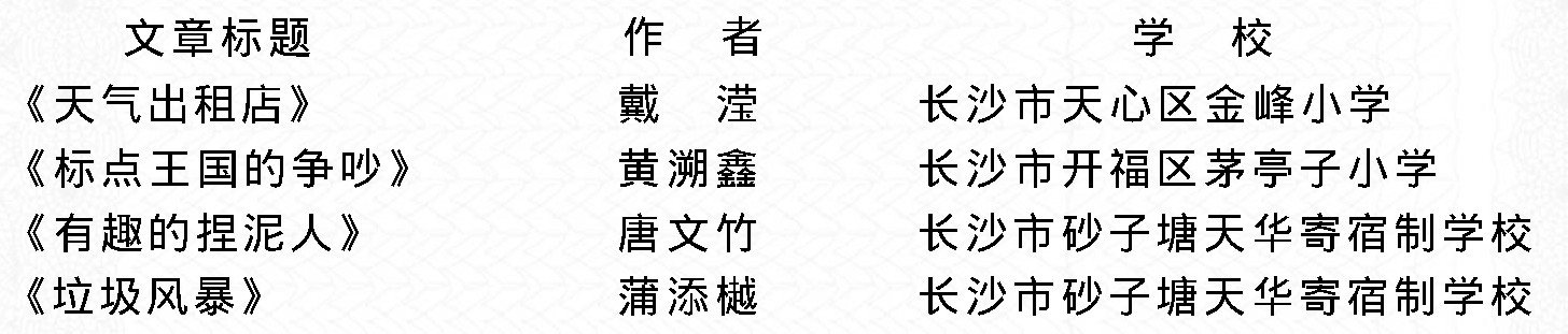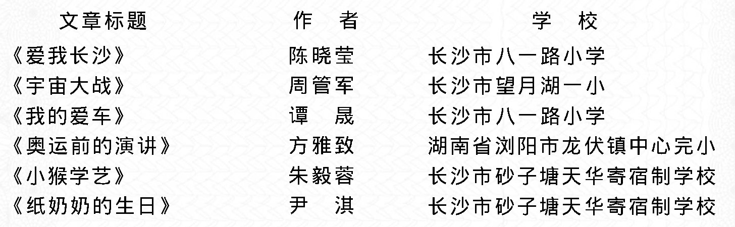 《科学启蒙》《中外童话画刊》2008年度在长沙市举行了首届“小学生才艺大赛”。活动得到了长沙市各个学校的大力支持,学生积极参与、踊跃交稿,涌现出大批优秀的作品。经过评审团和编辑部的严格评选,共评出一等奖4名、二等奖6名、三等奖7名,名单如下: