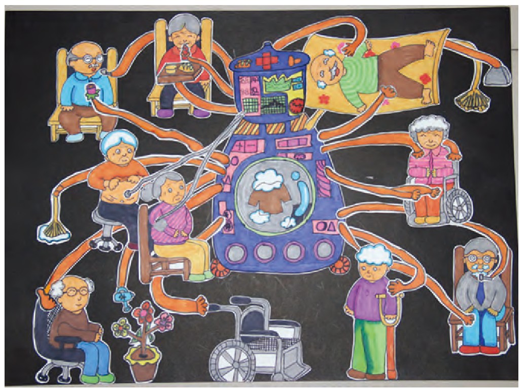 我设计的是一个可以帮助老人的多功能机器人,它可以做很多事情,比如帮老人按摩、刮胡子,给老人测血压血糖、喂水喂饭喂药,还可以搀扶行动不方便的老人。此外,它的大肚子还是一个洗衣机,能给老人们洗衣服,排出的废水被转化后会变成可以浇花的营养水。