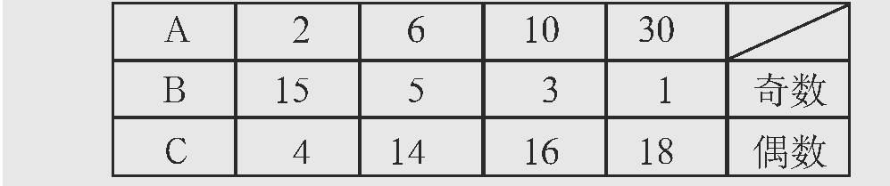 由(1)来看,A乘以B(奇数)等于30,将其可能的组合列表,同样把C(即19-B)也看一下。