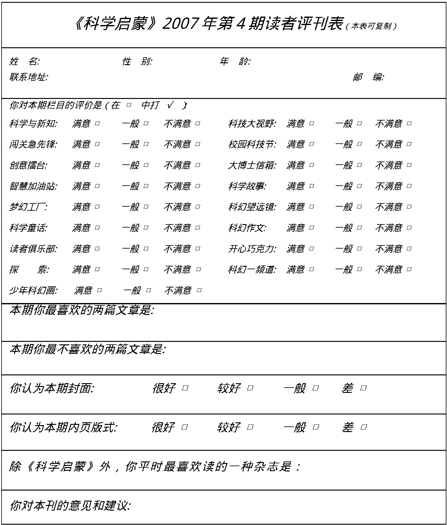 《科学启蒙》2007年第4期读者评刊表(本表可复制)