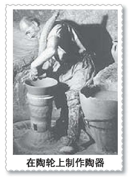时间机器:“呵呵,同学们别急嘛!之所以带大家到这里来,是因为车轮的产生与这里有关系。车轮的前身其实就是制作陶器用的轮子,最简单的陶轮只需一对盘形的轮子,轮子之间装一根轴,轴直立竖放;陶工一面用脚旋转下面的轮盘,一面用手将柔软的黏土置于上面的轮盘中,塑捏成形。”