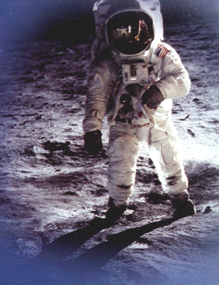 阿姆斯特朗首先走上舱门平台,面对陌生的月球世界凝视几分钟,挪动右脚,一步三停地爬下扶梯。5米高的9级台阶,他整整花了 3分钟!随后,他的左脚小心翼翼触及月球表面,而右脚仍然停留在台阶上。当他发现左脚陷入月面很少时,才鼓起勇气将右脚踏上月球表面。然后,他说了一句名言:“这是个人的一小步,却是人类的一大步。”