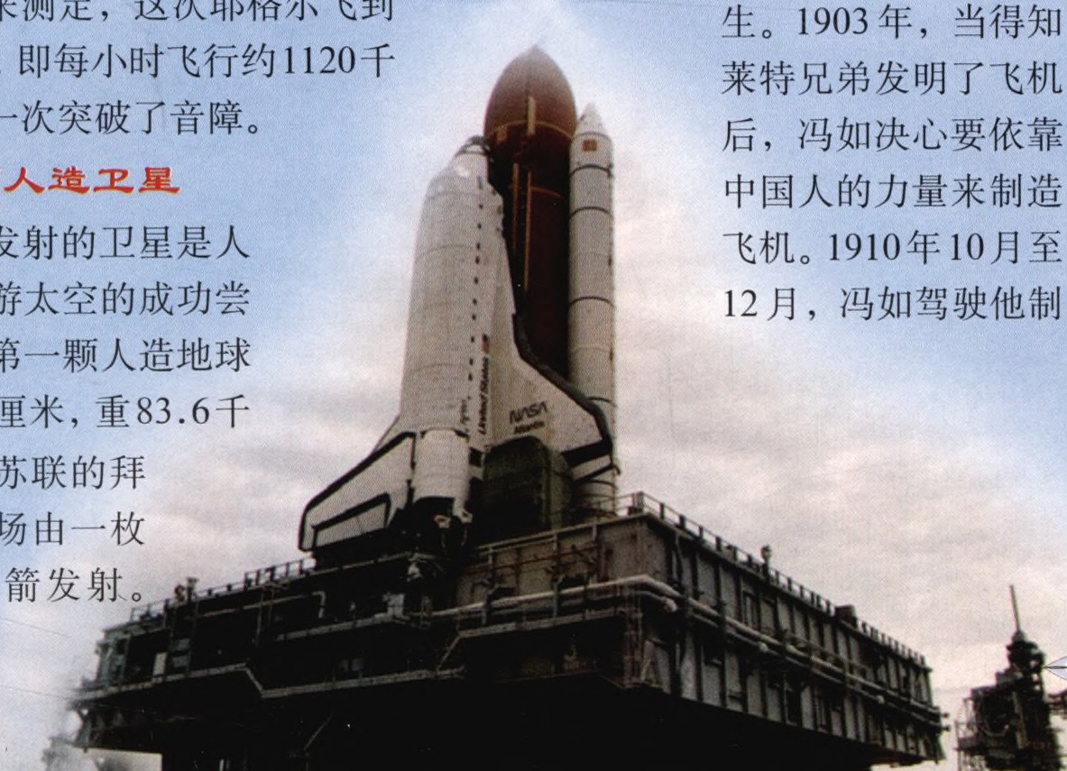 1981年4月12日,美国研制的第一架航天飞机“哥伦比亚”号第一次进入绕地球的轨道。航天飞机的中心部分是一个带翼的轨道飞行器,它的设计可供100次飞行。集束式助推器可以回收并重复使用。轨道飞行器有一巨大货舱,其他材料可放在舱内送进太空或从太空带回。