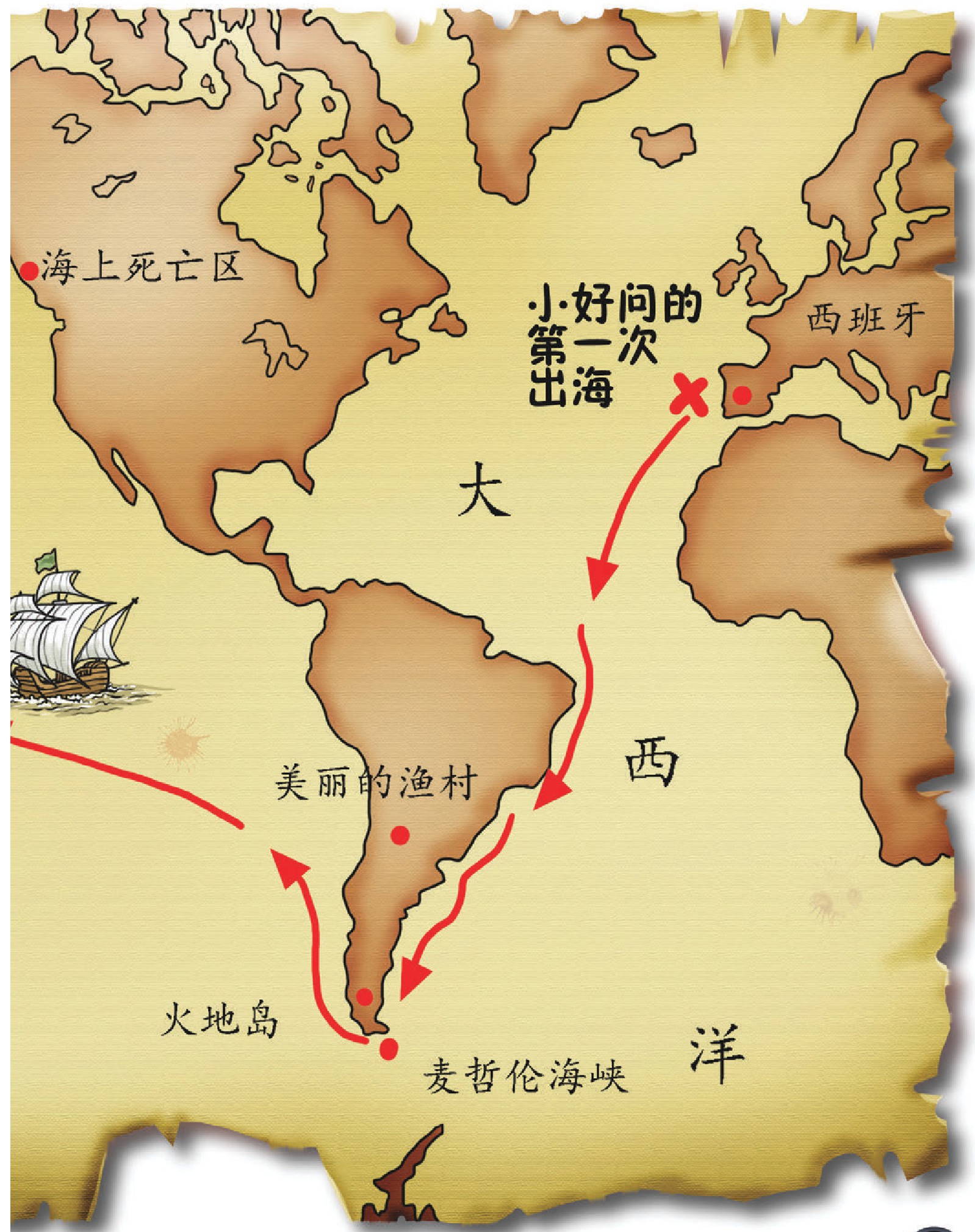 小灵通、小好问、小粗心在图书馆查找资料,无意中发现了一张陈旧的航海图纸,询问关主奥妙精灵才知道,原来这是一张麦哲伦船队的航海图。