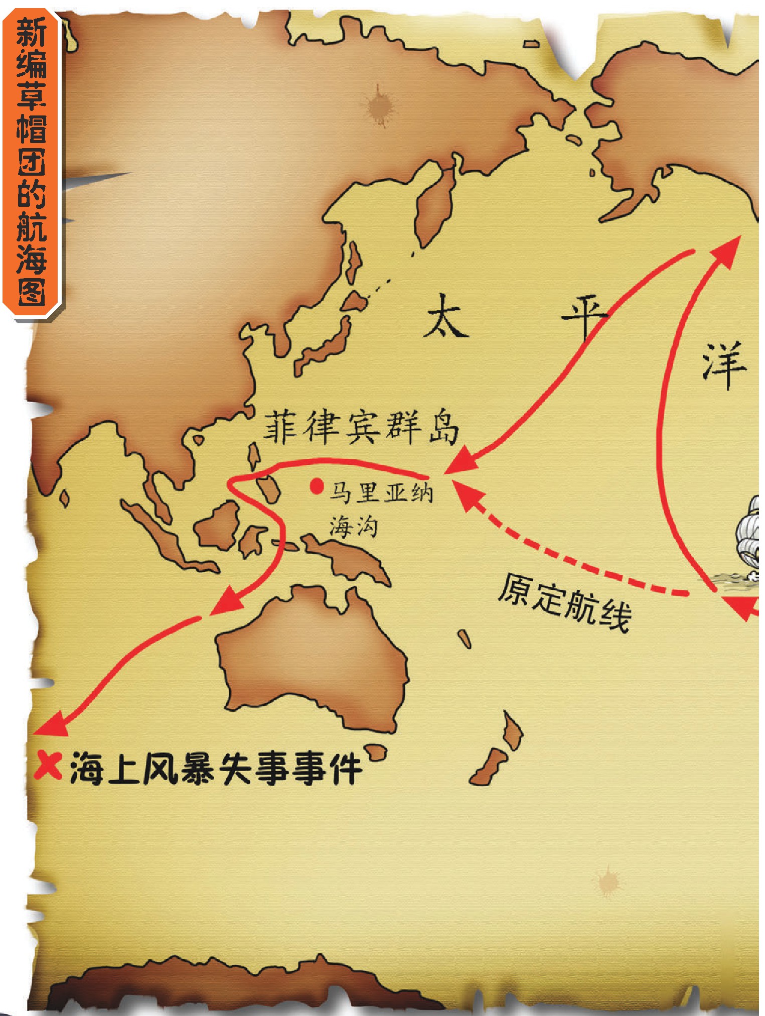 据图纸注释,在麦哲伦的航线中隐藏着一个巨大的宝藏。几个小伙伴激动不已,找来大博士商量一起出海寻宝。在大博士的邀请下,海贼王路飞也加入进来,并担任船长,还带来了白胡子生前秘密研制的“启蒙号”超速船。全新编制的草帽团带着寻宝的航海图,从西班牙出发,驶向浩浩大海,开始了一段神奇而惊险的海上寻宝之旅。