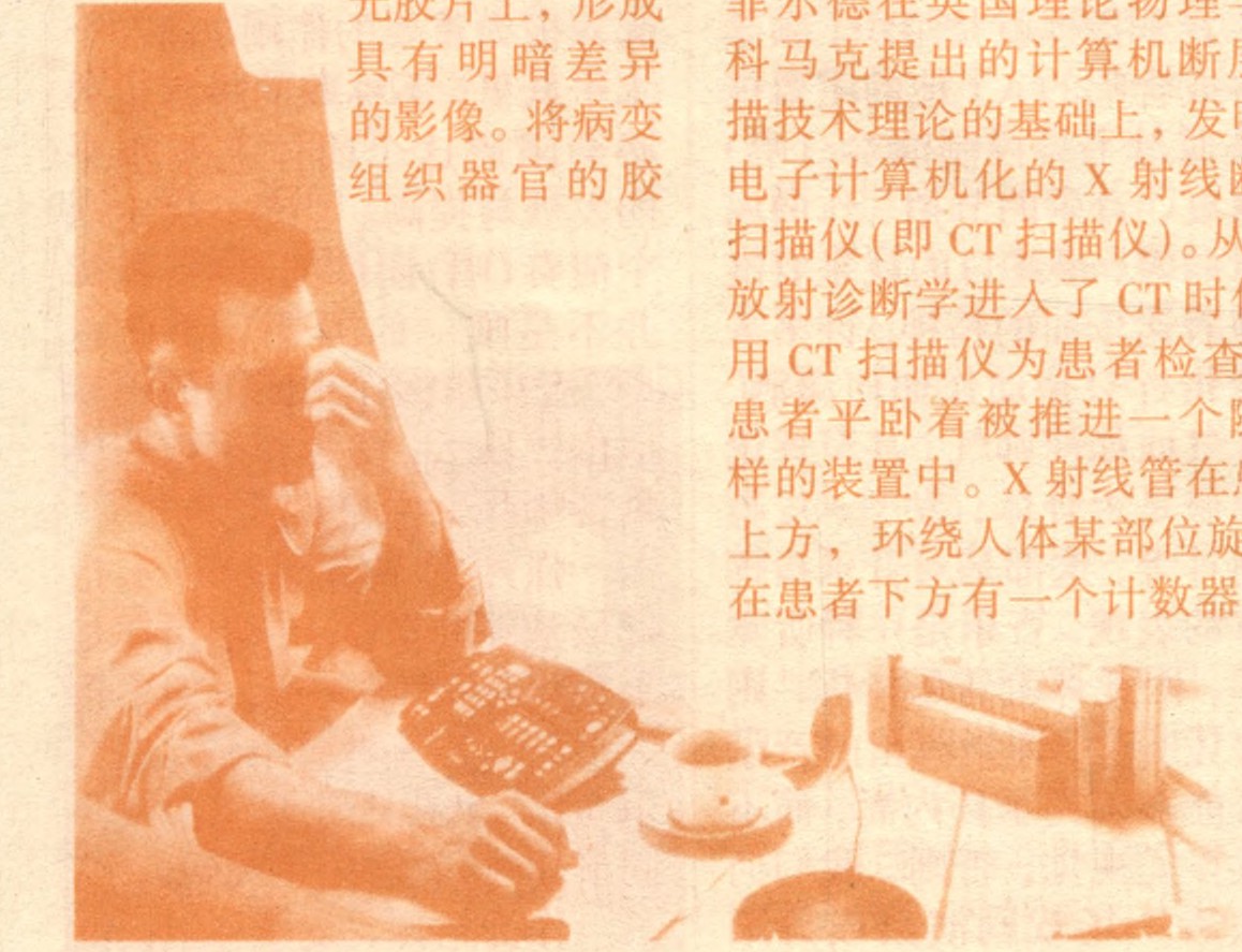 计算机的发明使X射线诊断疾病的功能得以完善。1971年,英国电气工程师豪斯菲尔德在英国理论物理学家科马克提出的计算机断层扫描技术理论的基础上,发明了电子计算机化的X射线断层扫描仪(即CT扫描仪)。从此,放射诊断学进入了CT时代。用CT扫描仪为患者检查时,患者平卧着被推进一个隧道样的装置中。X射线管在患者上方,环绕人体某部位旋转,在患者下方有一个计数器,随X射线管同步旋转,病变组织和正常组织对X射线吸收的差异就会显示在灵敏度极高的计数器上。经计算机处理后形成的这一部位的横断图像,远超过X射线透视胶片,使诊断更可靠。