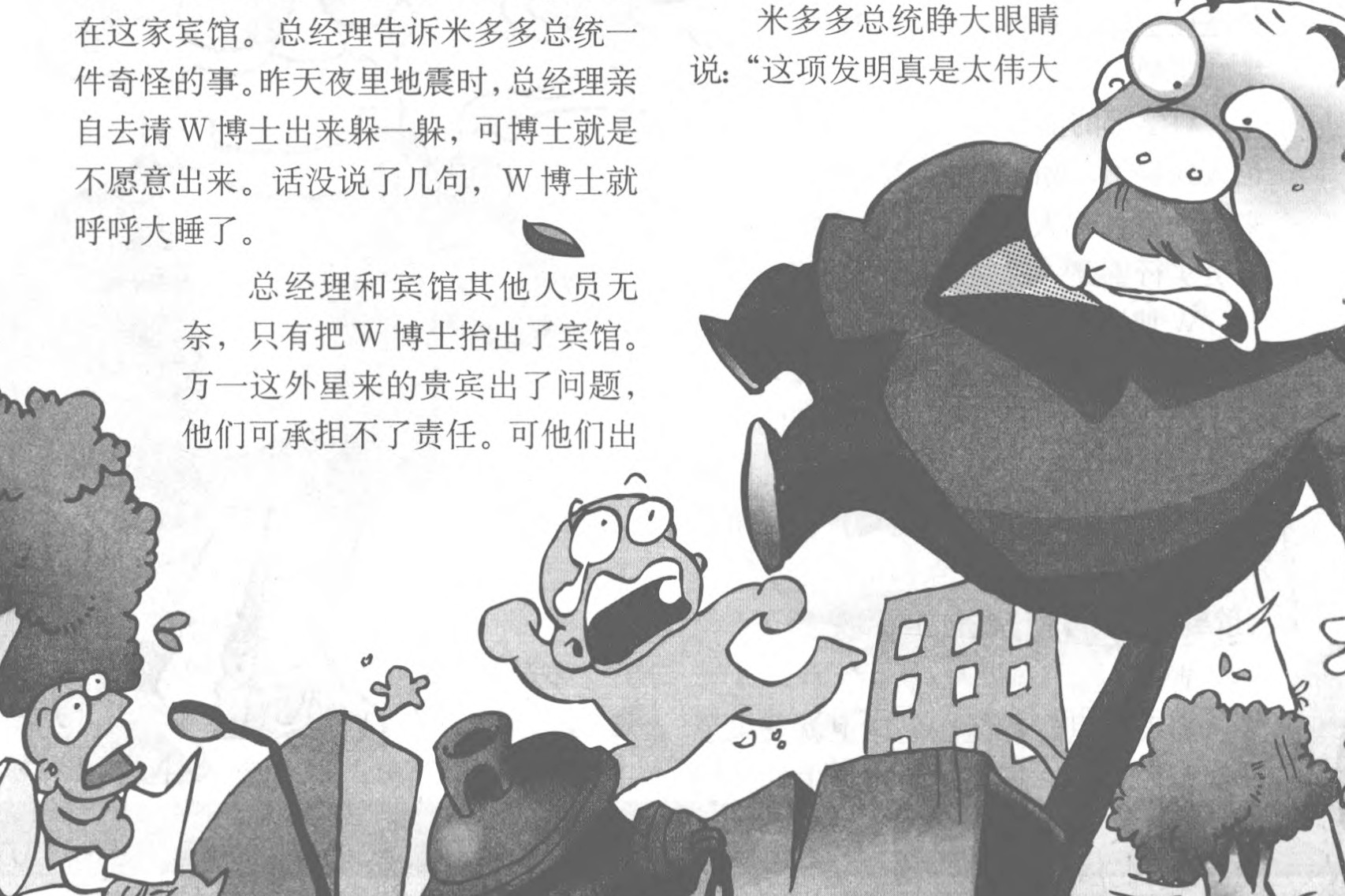 米多多总统让人把宾馆总经理找来了。一问,才知道地球人W博士就下榻在这家宾馆。总经理告诉米多多总统一件奇怪的事。昨天夜里地震时,总经理亲自去请W博士出来躲一躲,可博士就是不愿意出来。话没说了几句,W博士就呼呼大睡了。