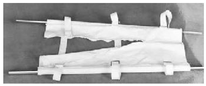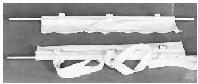 为了使担架功能更多,使用更方便,同时减轻伤病员的痛苦,经过一段时间的思考和研究,我在原担架的托布距侧边约三分之二的地方安装了一条拉链,通过拉链的拉开缝合使担架分离(如图一、二)。
