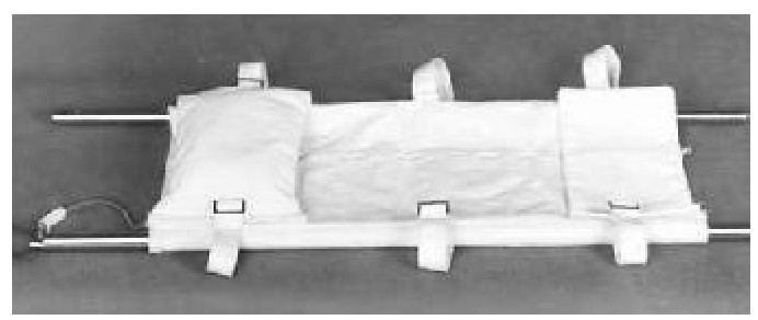 为了使担架的功能更完善,在担架的两端分别安装两个可以充气的气袋,做枕头或抬高双脚之用,同时再配备一个气筒放置在担架手柄的空管处(如图三)。