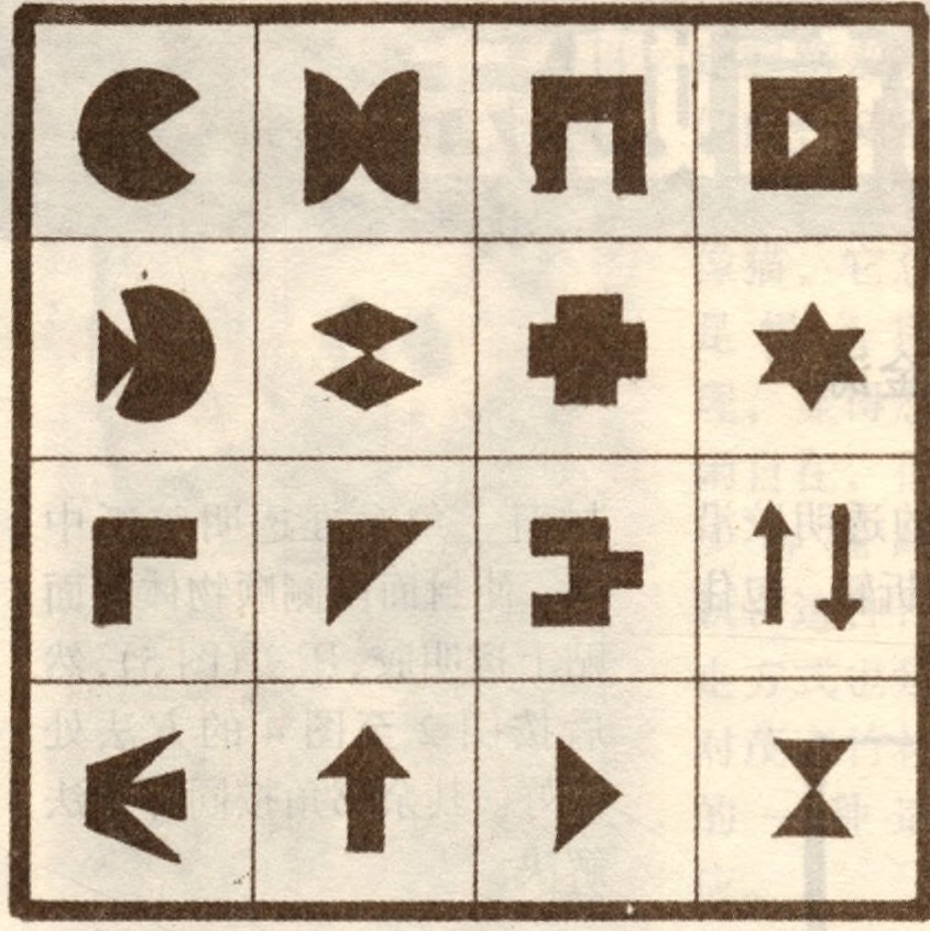 左边上图有16个不同的图形,请你仔细看上1分钟,然后把它遮住,凭记忆在右图上默画出来。画对了 14个以上者为优秀,对了 10个以上者为良好,对了 8个以上者为及格。