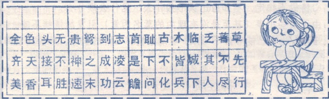 《巧填成语》:两国交战,兵强马壮,马不食草,兵不吃粮。体育用品为中国象棋。