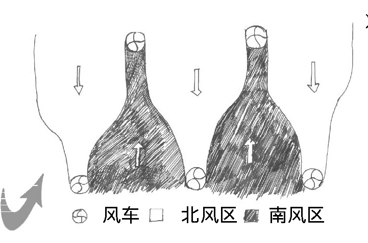 这是一个平面图,圆圈加x表示风车,白色表示北风区,黑色表示南风区,线条表示挡风墙。当刮北风时,北风全部从北风区流过,带动风车转动,风车再带动发电机转动,从而发出电来。当刮南风时,南风全部从南风区流过,带动风车转动,风车再带动发电机转动,从而发出电来。
