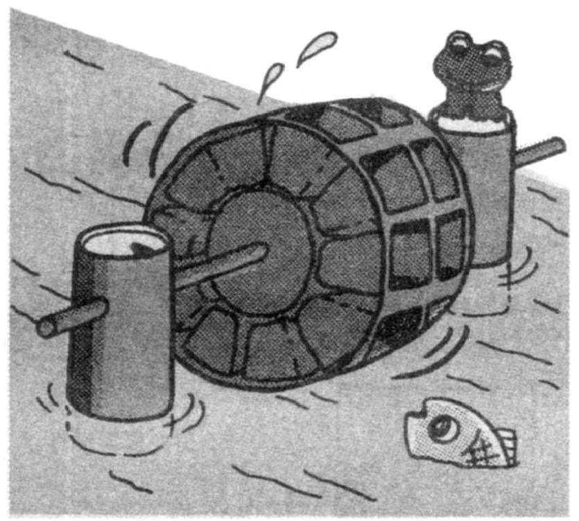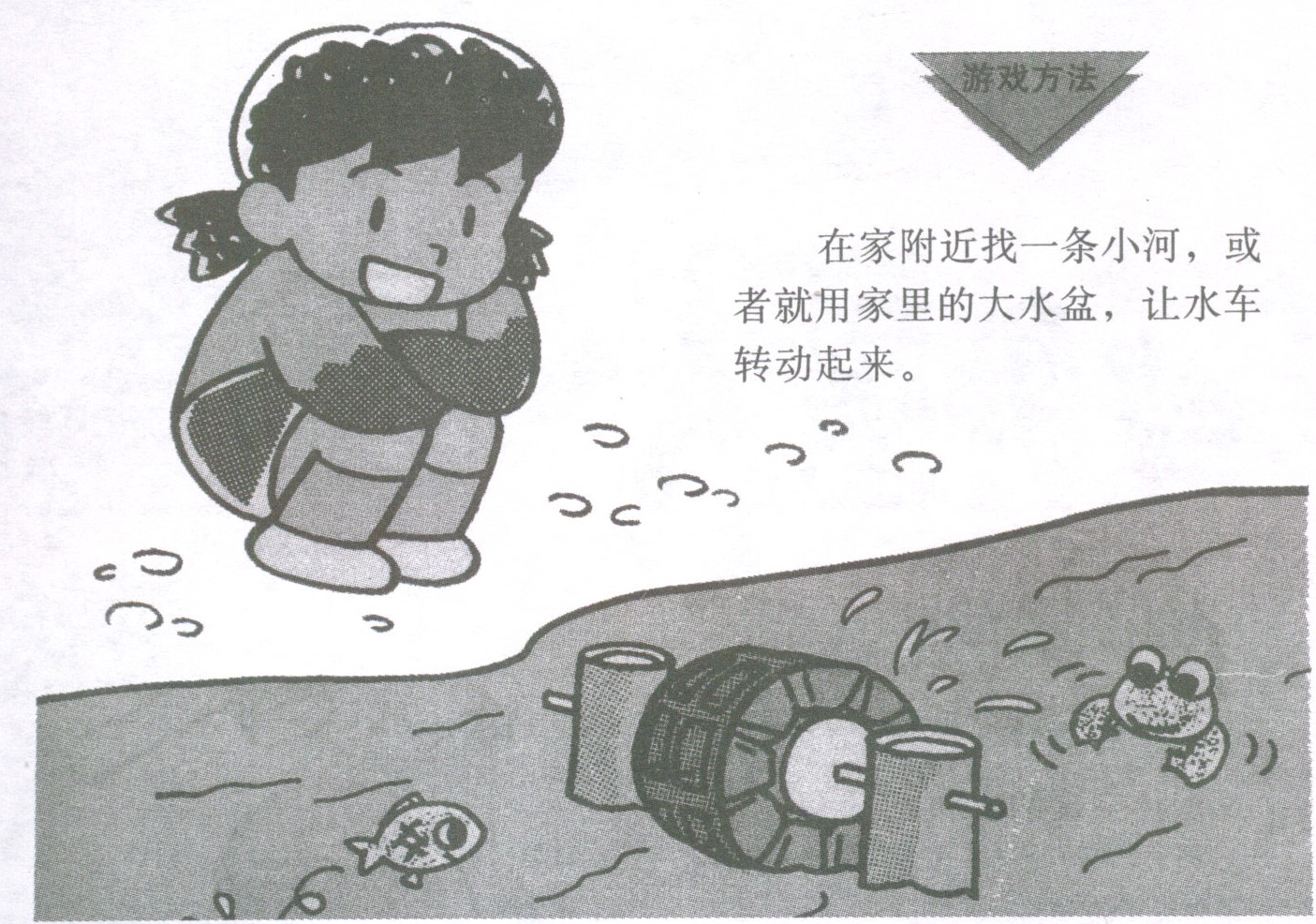 在家附近找一条小河,或者就用家里的大水盆,让水车转动起来。