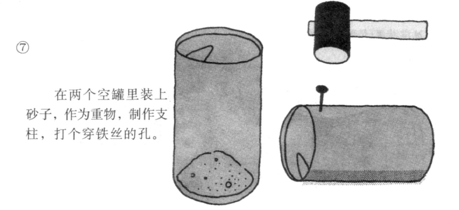 在两个空罐里装砂子,作为重物,制作柱,打个穿铁丝的孔。