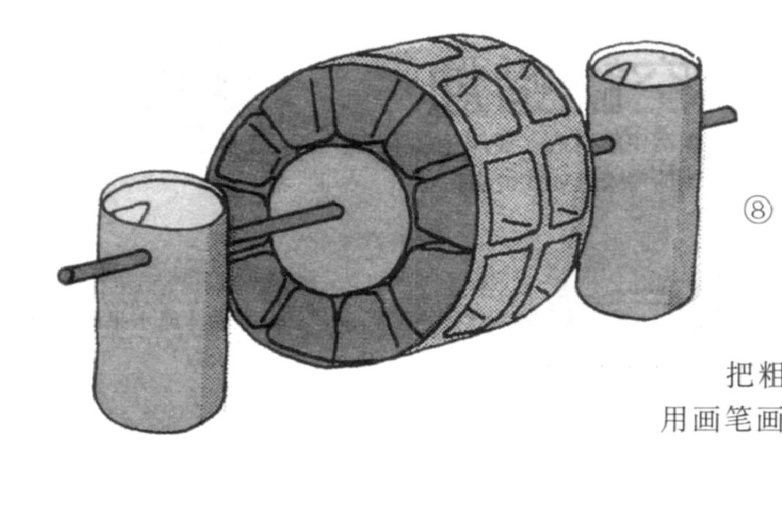 把粗铁丝穿过支柱孔,用画笔画上颜色和图案。