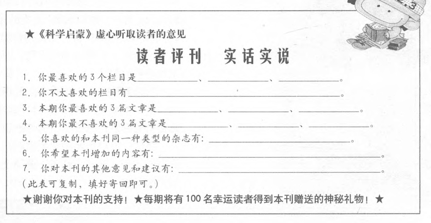 希望有志于科普和科幻创作的各界人士、在校学生多多赐稿。只要是9~16岁的读者喜欢的稿件,无论是科普还是科幻方面的都热烈欢迎。限于篇幅,若非特殊情况,科普方面的来稿请控制在2000字以内,科幻方面的来稿请控制在2500字以内。