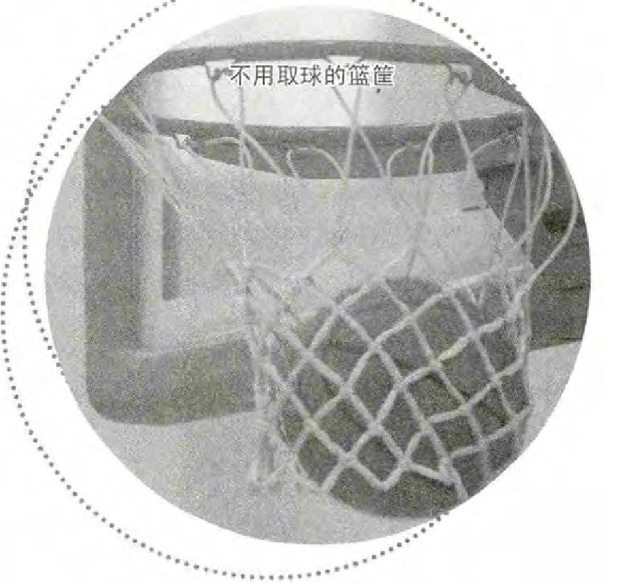 “噢,你们能别投那么勤快吗?看,又投进去了。可怜我,又要爬上去拿球了。”一个高个同学抱怨道。这节体育课下课后,詹姆士站在篮筐下,他决定要改造一下这两个篮筐。他爬上去,把筐子底剪掉了。