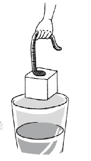 “好啦!一切准备就绪,‘钓’冰块游戏现在正式开始。”爸爸接过棉线,对小豆丁比划了一个“OK”的手势,继续说,“咱们先把冰块放到水中,一般情况下,冰块的密度比水的密度小,所以冰块会浮在水面上。你看,是不是有一部分冰块露出了水面?”