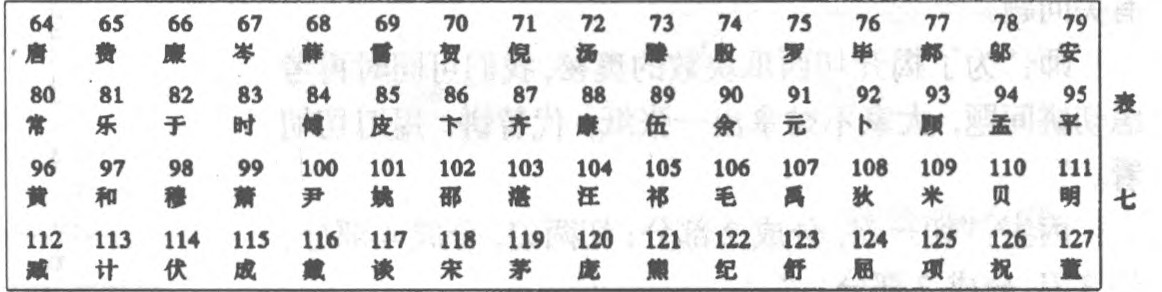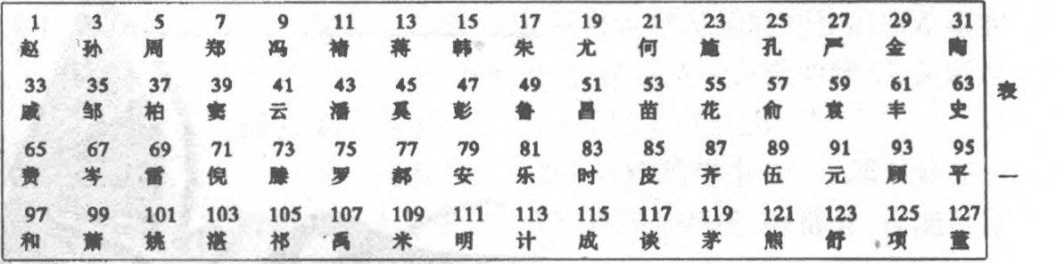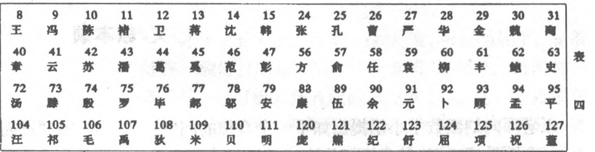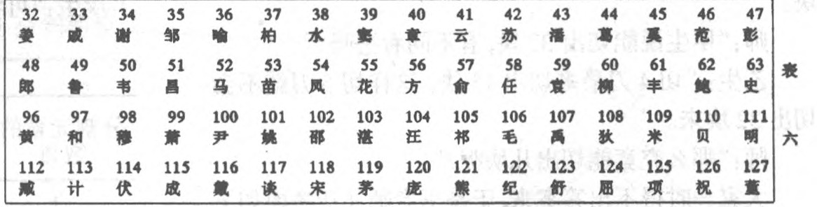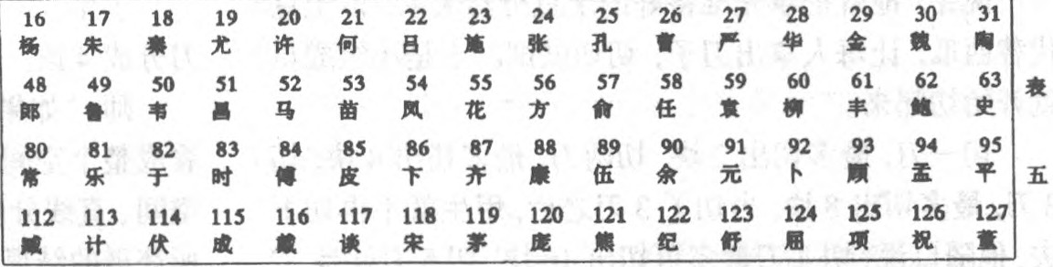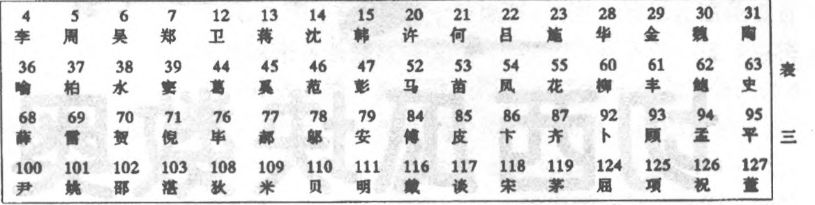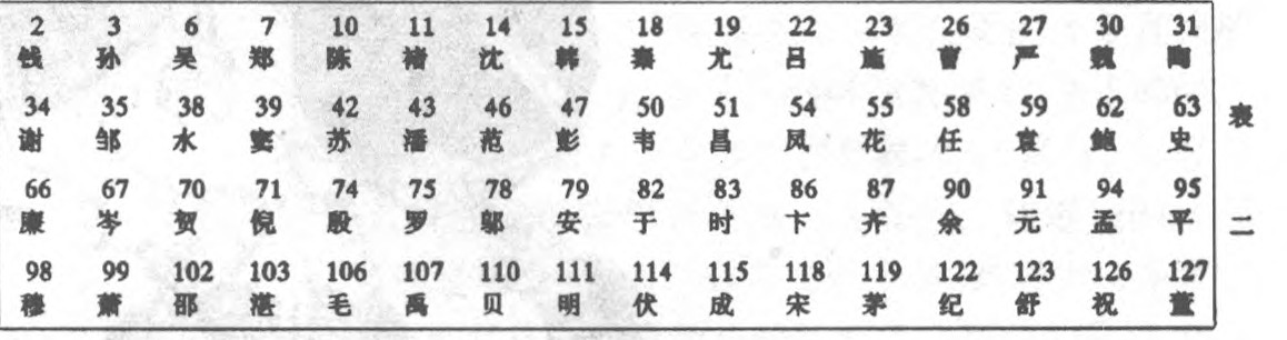 表格上127个字是百家姓的前127个姓氏。为了方便起见,我们就把猜姓氏的表格和猜年龄的表格合在一起了。这样做,是由于猜姓氏的图表的由来和上面的差不多,只是稍微有点不同:我们要把数字换成姓氏。其实也简单:先编好一些年龄表一样的表格,然后根据表中的最大数字N,从百家姓中选取前N个姓氏按顺序与1~N的N个整数一一对应好,即让一个数字固定地代表一个姓。最后把表中的数字全部用它们所代表的姓氏代替,姓氏推算表便制成了。当然也可从把姓氏列在年龄表数字旁边,像上面的表一样两表合一。使用时,按猜年龄同样的方法,你问清楚受试者他的姓氏可从哪几个表中找到,再把这几个表中的数字(如果不是两表合一,则为汉字所代表的数字)的第一个数相加,然后找到所得的和代表的姓,那么这个姓就是受试者的姓了。我们不妨用上面的7个表格试一下。你的朋友如果说他的姓可从第一、三、五张表中可找到,我们就把表一、表三、表五中的第一个数1、4、16相加,即得21,我们就根据所记的数字、姓氏对应表(附后)把21所代表—的姓——“何”说出来,那么你的这位朋友必定是姓何了。同猜年龄一样,这里猜姓氏也受到限制,只能猜百家姓的前127个姓,如果要猜更多的姓,就只有根据需要重新编制表格了。