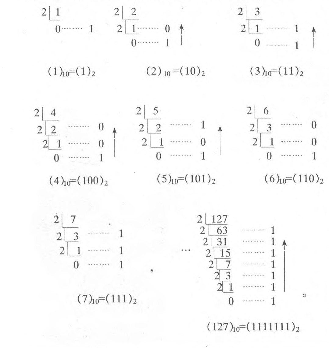 年龄表是怎么来的呢?我们都知道,平常使用的一般是十进制数,而年龄表是根据二进制原理设计出来,那么十进制数怎样才能转化为二进制数呢?请朋友们记住,二进制最基本的规定是逢二进一。一个十进制整数要化为二进制整数只需把这个十进制数一次又一次地除以2,每次得到的余数就是二进制数,但需注意,要从最后一个余数写起。如,1除以2,由于不能整除,可看为商数为0,余数为1,那么十进制数1的二进制数也为1; 2除以2,商数为1,末数为0, 1再除以2,商数为0,余数为1,所以十进制数2的二进制数为10;再如3除以2、4除以2、5除以2……依此类推,可知3、4、5、6、7……、127等十进制数的二进制数分别为:11、100、101、110、111、1000、……、1111111。图示如上,其中括号外的小字体数10、2分别表示括号内的数为10进制数和2进制数。我们把1~127的127个数全部化为二进制数后,现在来一个规定:凡是倒数第一位为1的二进制数,我们把它们的十进制数按顺序列为一个表,这样可得64个数;凡是倒数第二个数为1的二进制数,我们把它们的十进制列为一个表,这样又可得64个数。依此类推,恰好可得到7张含有64个数字的表格,即我们所看到的这7个年龄表格。