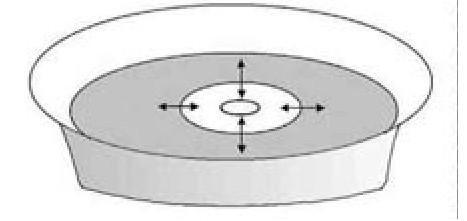 3.用滴管从盛有95%浓度酒精的瓶内,取少量酒精,滴几滴在瓷盆的中心位置。认真观察你就会看到,在盆底、酒精和水之间有一条很明显的分界线,在这条分界线上,酒精和水仿佛在进行一场“拉力赛”:蓝色水的一方拼命用力向外拉,而酒精一方则全力向里拉,像拔河比赛一样,有趣极了(如图4)。