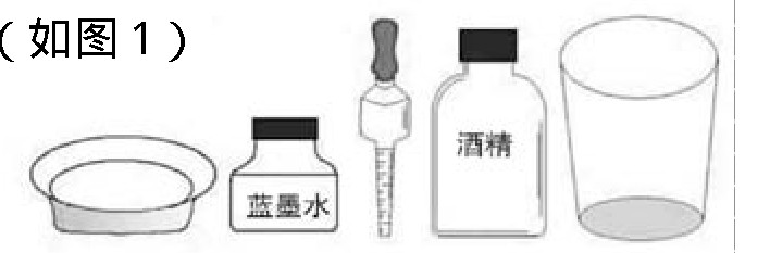 乳白色平底瓷盆、滴管、清水、蓝墨水、浓度为95%的酒精、塑料杯。(如图1)