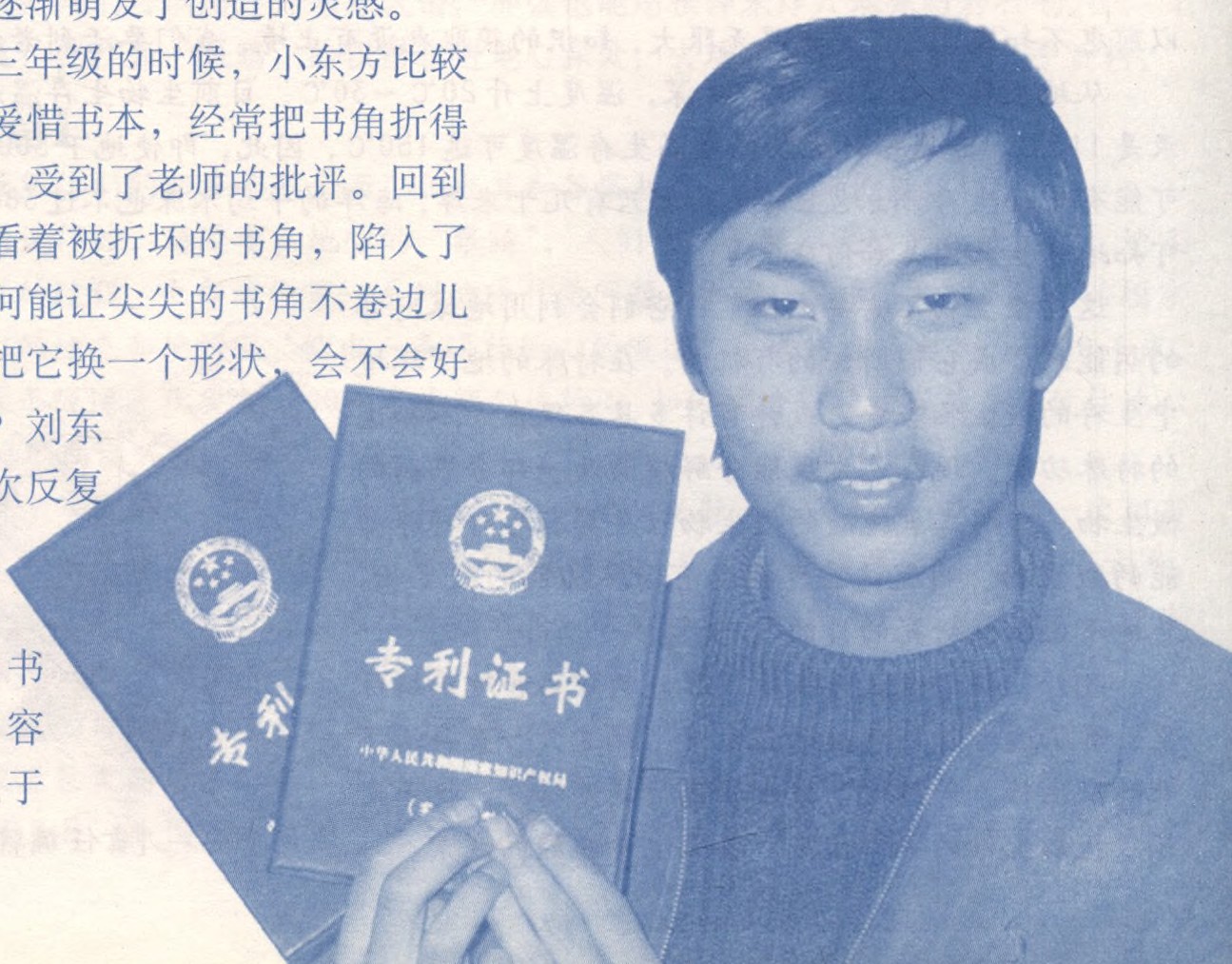 小学三年级的时候,小东方比较贪玩,不爱惜书本,经常把书角折得乱七八糟,受到了老师的批评。回到家里,他看着被折坏的书角,陷入了思考,如何能让尖尖的书角不卷边儿呢?如果把它换一个形状,会不会好一点儿呢?刘东方经过多次反实验,终于发现带,有弧度的书角比较不容易卷边儿。于是,他买来了切割工具,把书角做成了带有弧度的非直角形。改成这一形状后,书角果然不容易卷边了。这一发明让他拥有了国家专利。