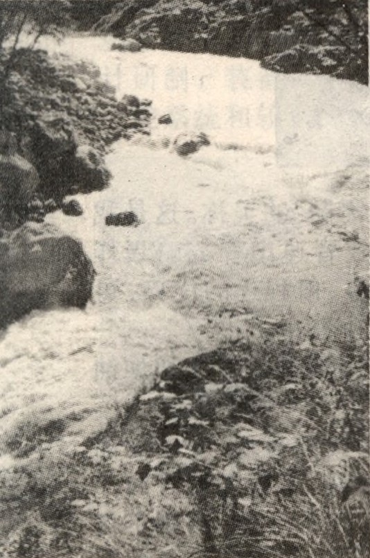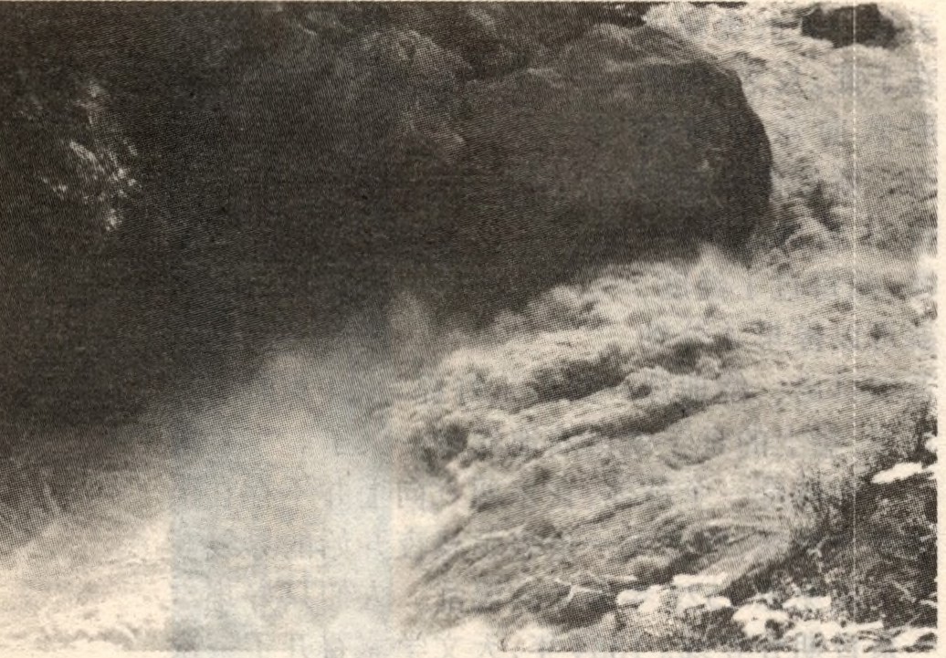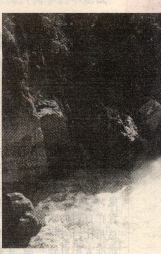 当我和小金从一个石头向另一个石头跳跃着前进到距江面收束口不足100米的地方时,只见一江白色波涛向下游迭落而去,江水的轰鸣声使我们讲话必须嘴巴对着耳朵。迭落的江流溅起的水浪足有四五十米高——那里分明是一处气势磅礴的大瀑布!除大瀑布之外,附近江面上还有两个小瀑布。于是直感告诉我在雅鲁藏布大峡谷不仅存在一些大瀑布,而且发育着以某一大瀑布为主的,属连续迭水型的瀑布群。当见到快步赶来的高登义教授时,我建议引进“瀑布群”概念以作为这次徒步考察穿越的又一研究新成果。老高完全同意。由于瀑布分队发现大瀑布的考察营地附近的小山溪有民工称其为“绒扎曲”,于是和高登义教授等商议后,暂将大瀑布定名为“绒扎瀑布”。