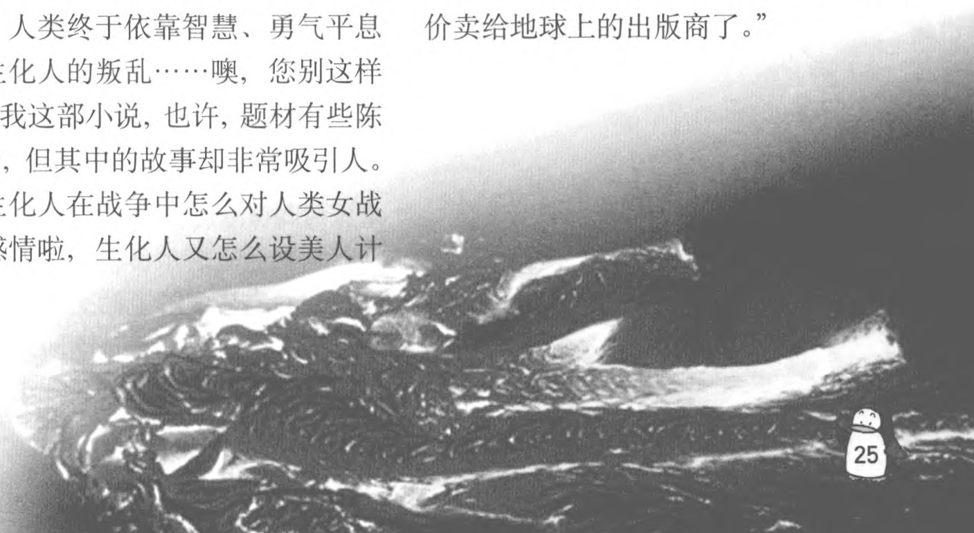 说到书,我马上恢复了信心:“这部幻想小说,讲述未来的机器生化人叛乱,他们企图推翻人类的统治……通过漫长的战争,人类终于依靠智慧、勇气平息了机器生化人的叛乱……噢,您别这样看着我。我这部小说,也许,题材有些陈旧、老套,但其中的故事却非常吸引人。如机器生化人在战争中怎么对人类女战。士产生感情啦,生化人又怎么设美人计啦,都很吸引人……啊,您怎么啦?哪儿不舒服?”