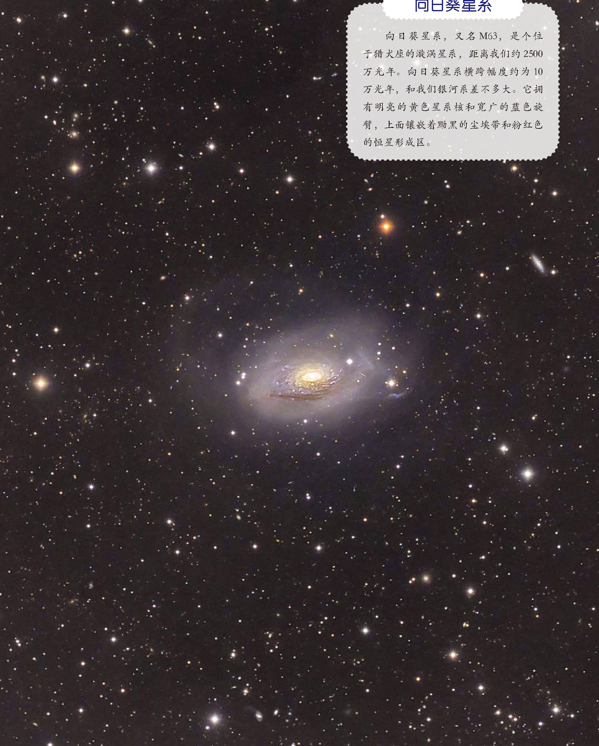 向日葵星系,又名M63,是个位于猎犬座的漩涡星系,距离我们约2500万光年。向日葵星系横跨幅度约为10万光年,和我们银河系差不多大。它拥有明亮的黄色星系核和宽广的蓝色旋臂,上面镶嵌着黝黑的尘埃带和粉红色的恒星形成区。