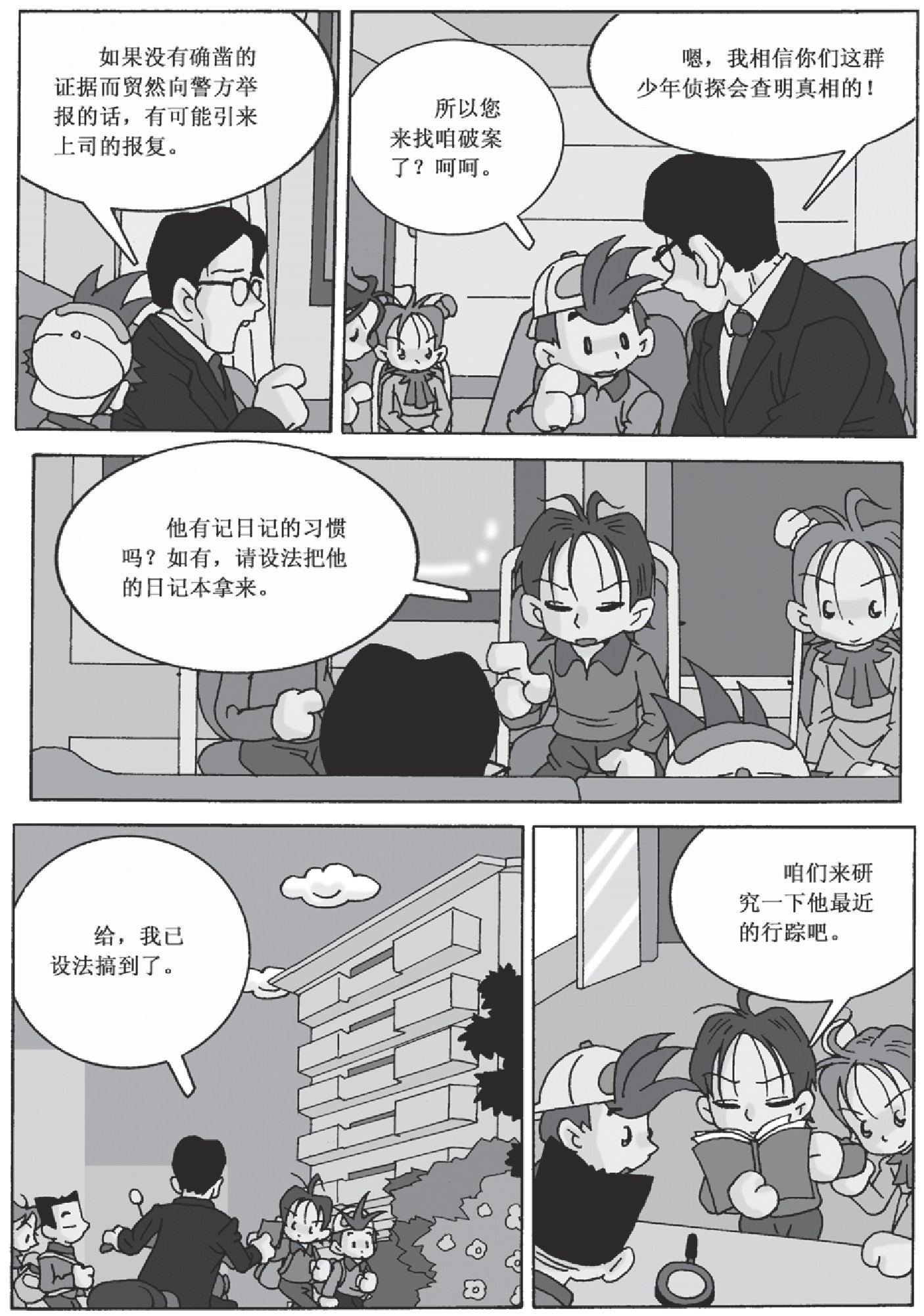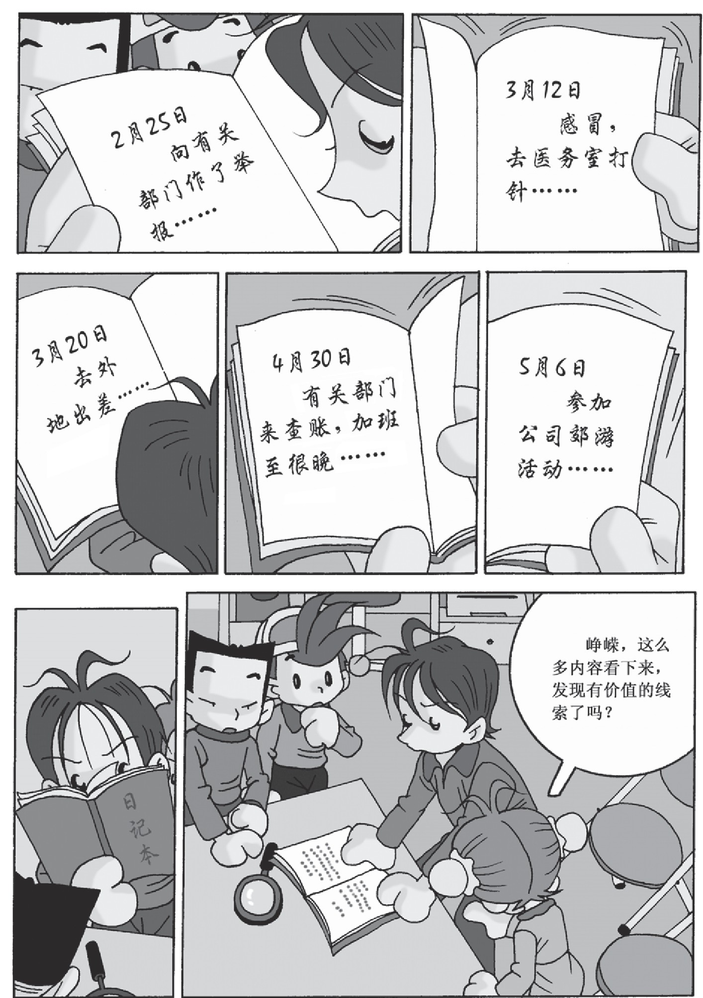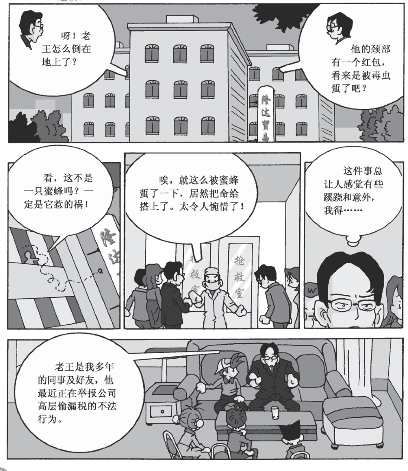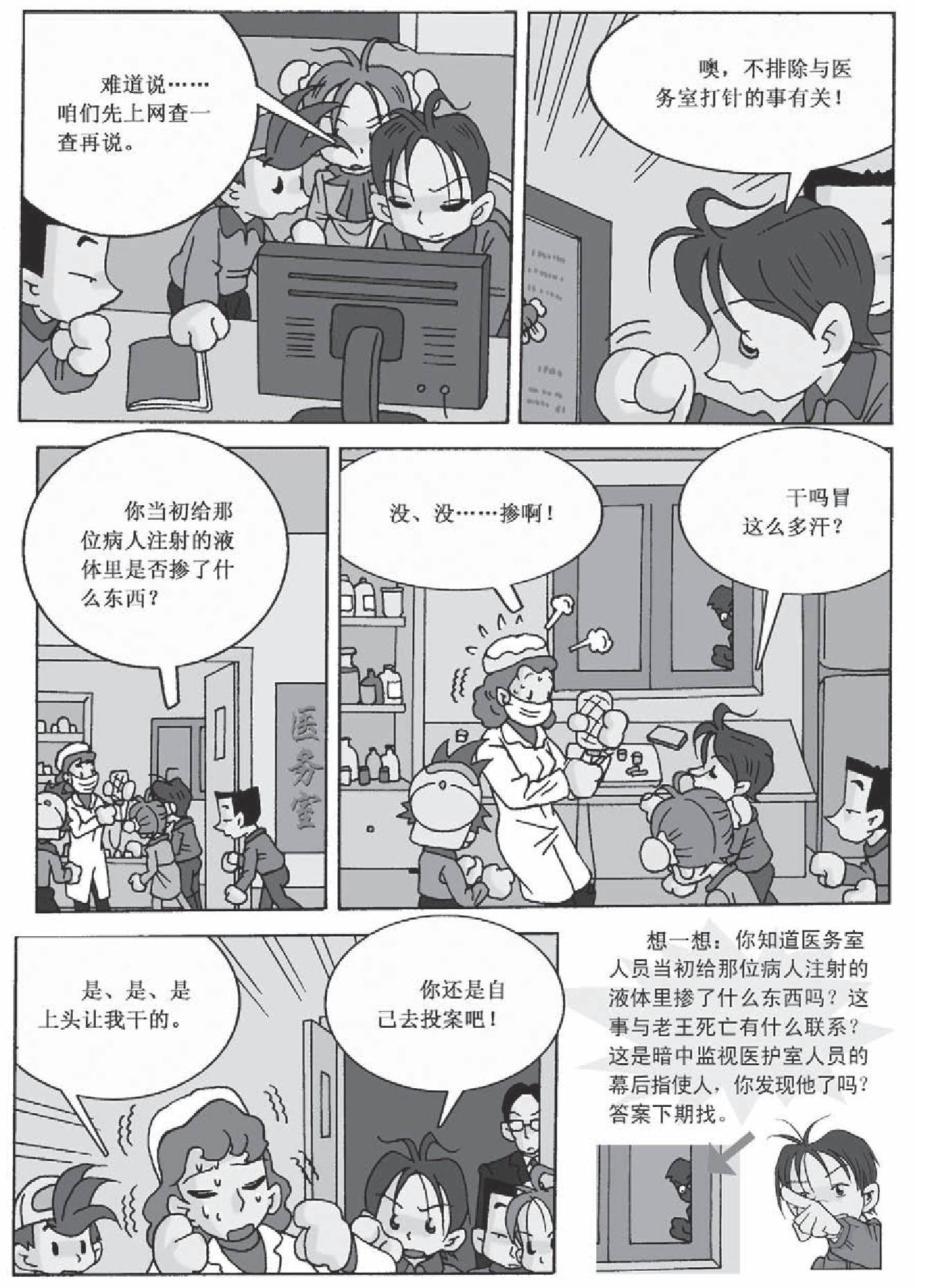 想一想:你知道医务室人员当初给那位病人注射的液体里摻了什么东西吗?这事与老王死亡有什么联系?这是暗中监视医护室人员的幕后指使人,你发现他了吗?答案下期找。